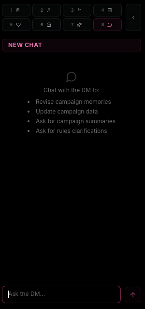 Go to the new Chat tab to talk with your DM. The DM has full access to edit memories, update soul and health, answer questions about the game, fix quest and rumor information, and solve most campaign issues without costing you rounds.