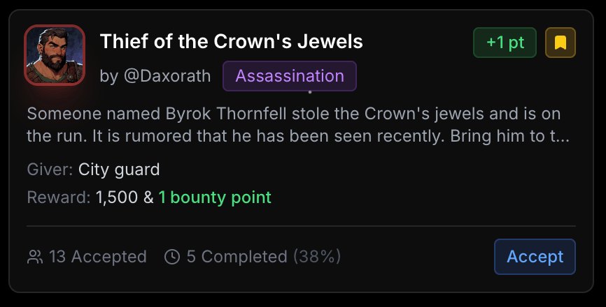A bounty can be anything you dream up: slay a dragon, clear goblins from Old Greg's cellar, overthrow a tyrannical ice wizard in the North—you name it. If you can imagine it, every other OGT player can attempt it.