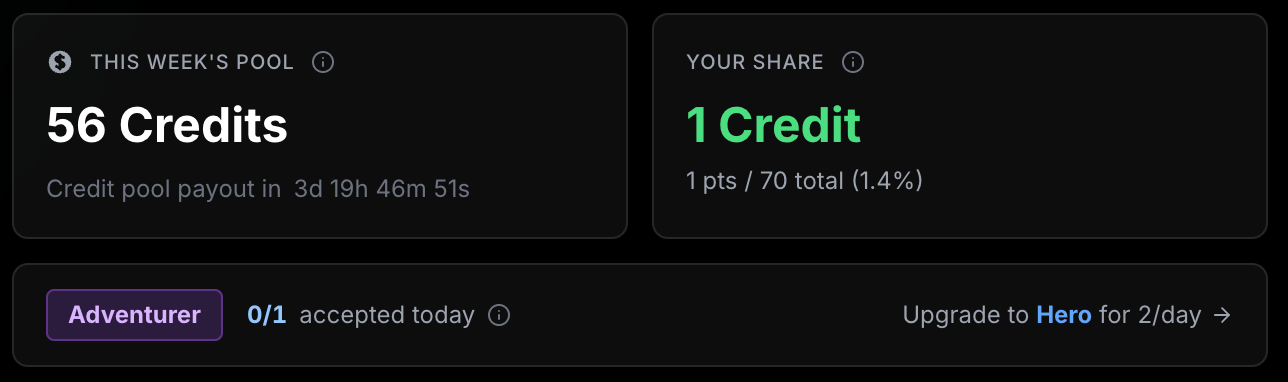 At the end of each week, all credits from bounty creation are pooled together. Old Greg matches that pool 1:1, so if 30 bounties were created for 30 credits, Old Greg adds another 30 to make it 60 total.