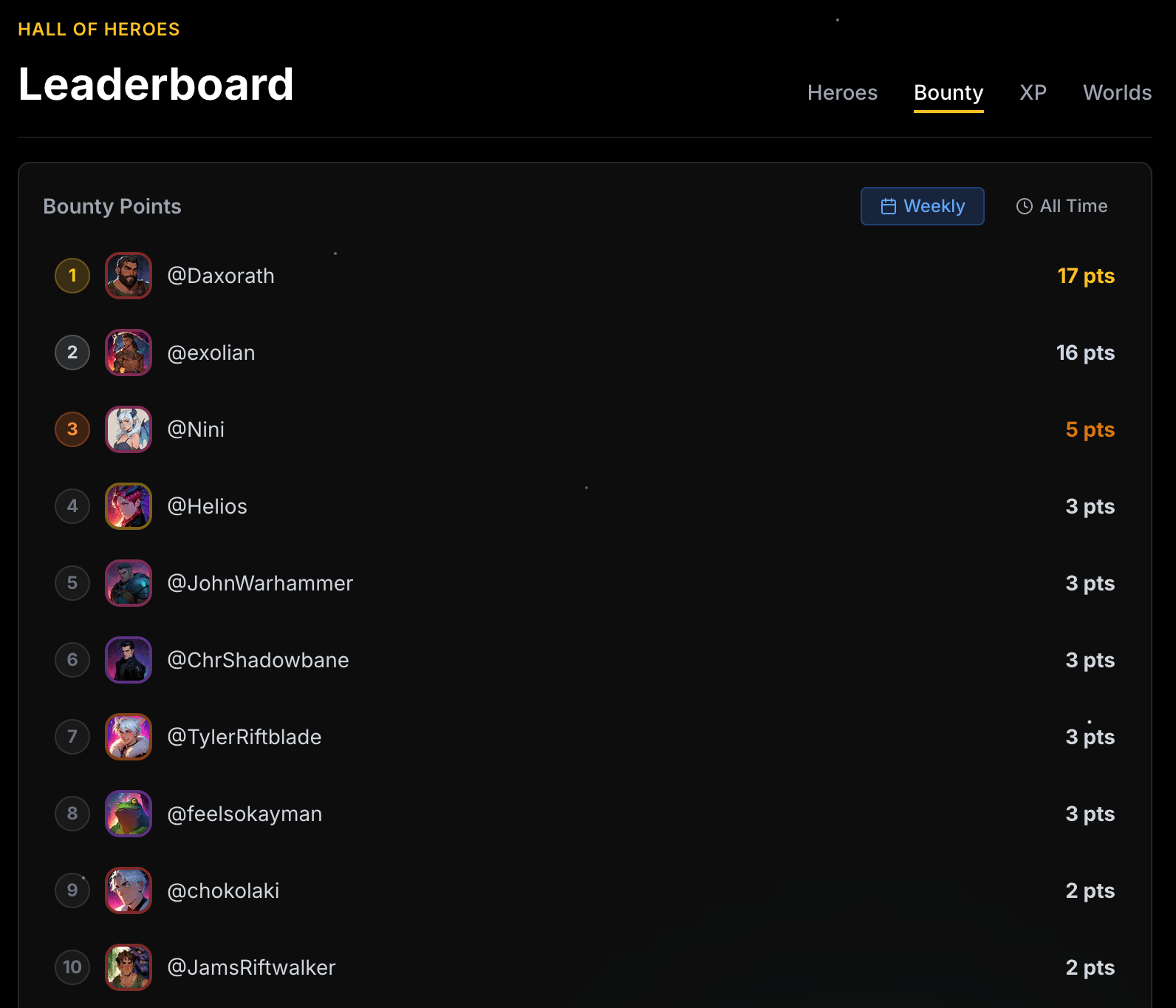 The Hall of Heroes has been completely overhauled to showcase more than just heroes. Now you can see OGT's top players ranked by total XP, bounty points, World plays, and highest-leveled characters. See where you stack up against the community.