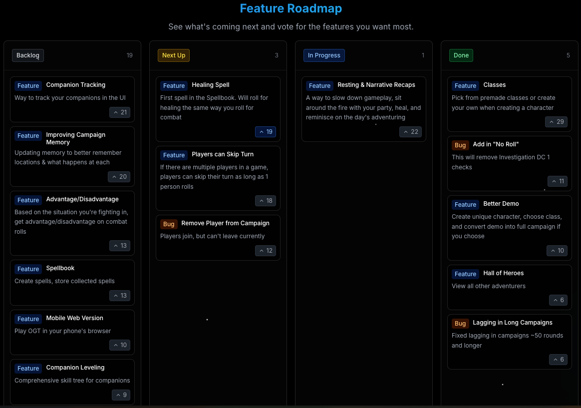 Vote on what’s coming up next for OGT! Features with the most votes will be prioritized. Classes were the most upvoted feature and are now in the game, only 12 hours after we launched the roadmap!