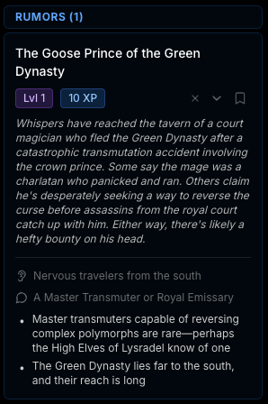 Every rumor points to an NPC who holds the full story. Talk to them, and they'll lay out the problem and specify your reward. That's when the rumor becomes an official quest.